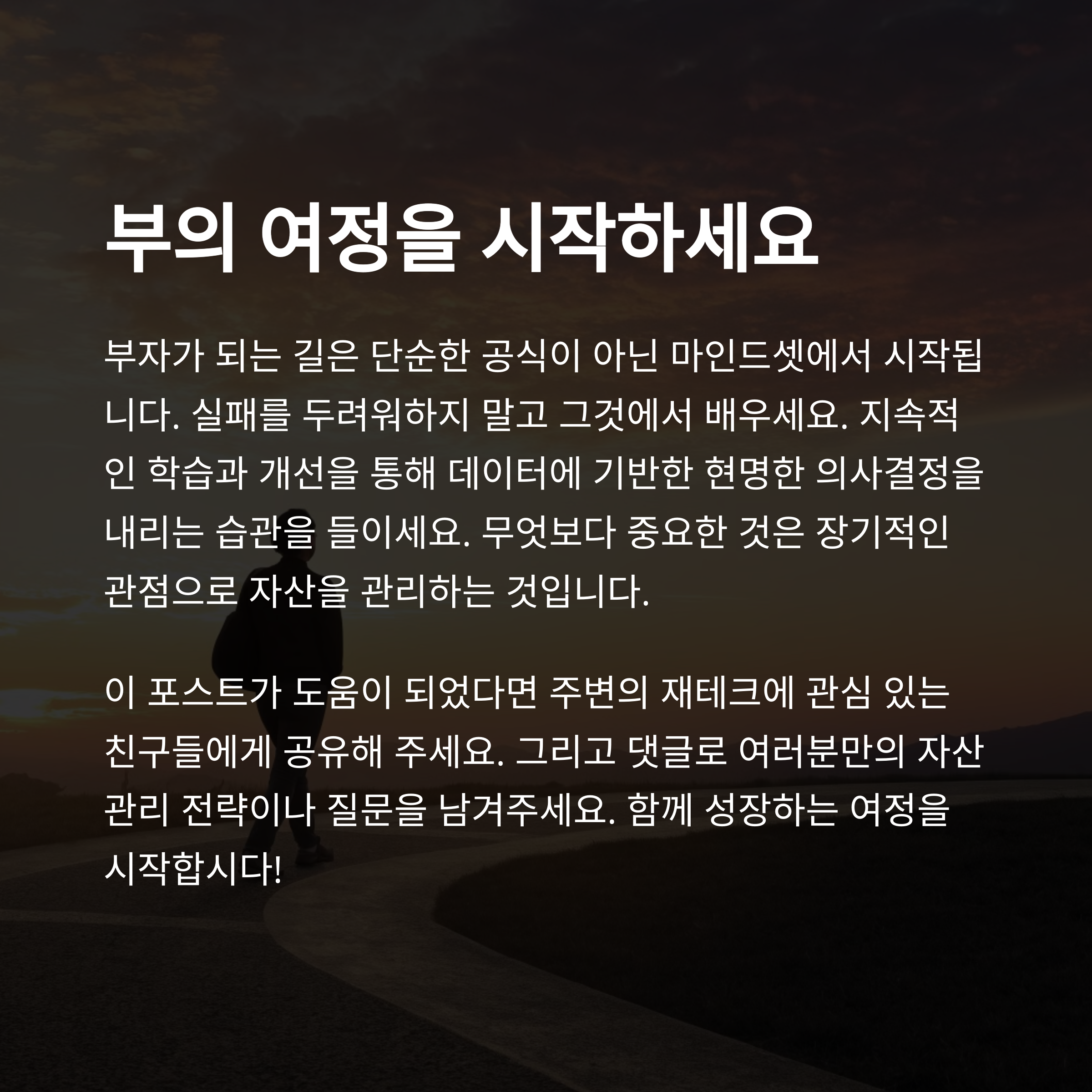 투자에 있어 실패는 누구나 겪는 일입니다. 하지만 실패의 원인을 분석하고 이를 발판 삼아 더 나은 전략을 세우는 과정이 부자가 되는 길에서 매우 중요합니다. 단기적인 손실에 집착하기보다는 장기적인 시각에서 자산을 운영하고, 꾸준히 학습하고 시장의 흐름을 파악하는 태도가 필요합니다. 특히 부자들은 금융자산과 부동산 투자를 통해 수익을 분산하고, 위기를 기회로 삼는 능력을 갖추고 있습니다.