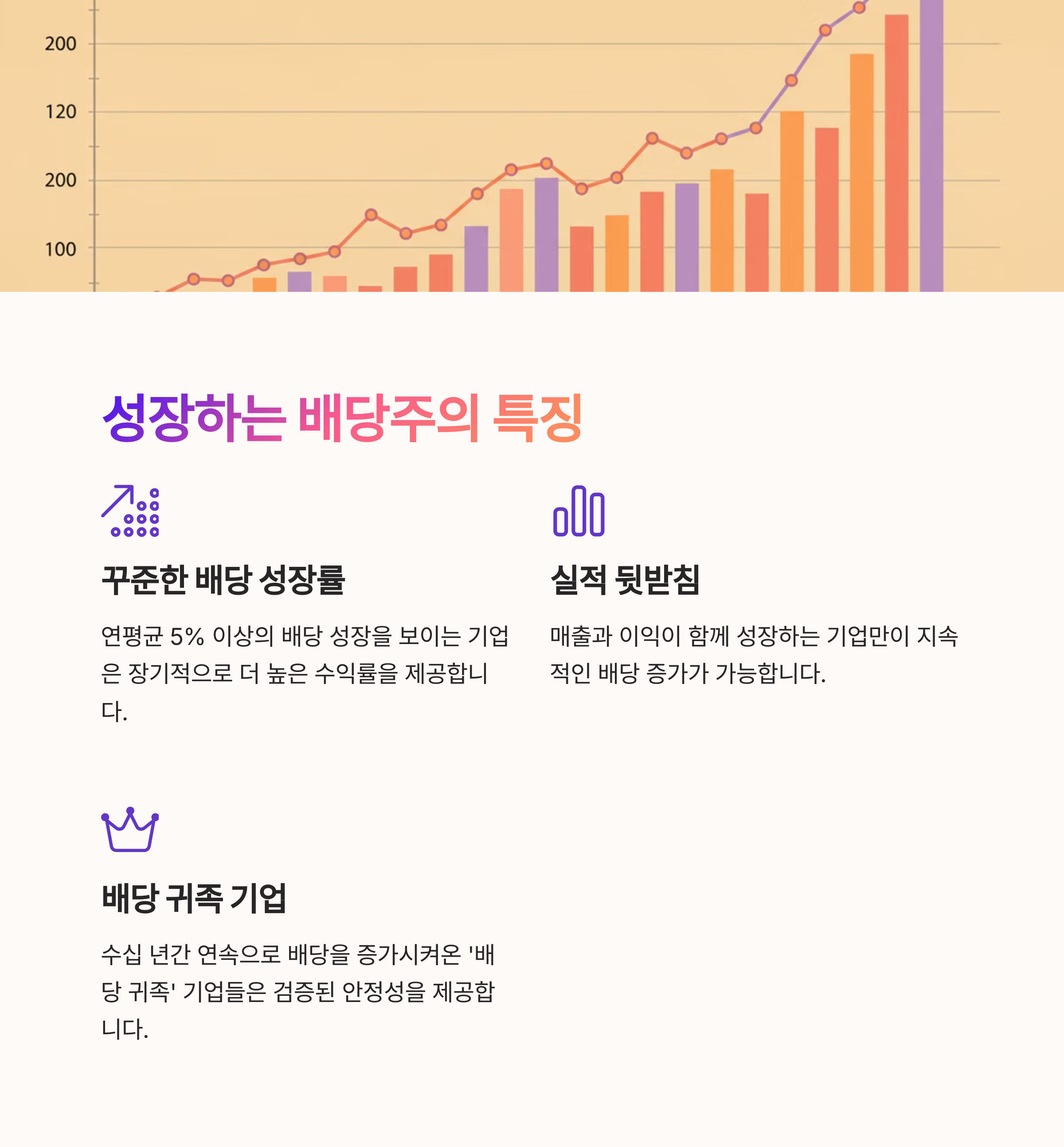 | 배당 성장성 | 지속적으로 배당금을 늘려가는 기업의 안정적 투자 지표입니다. |