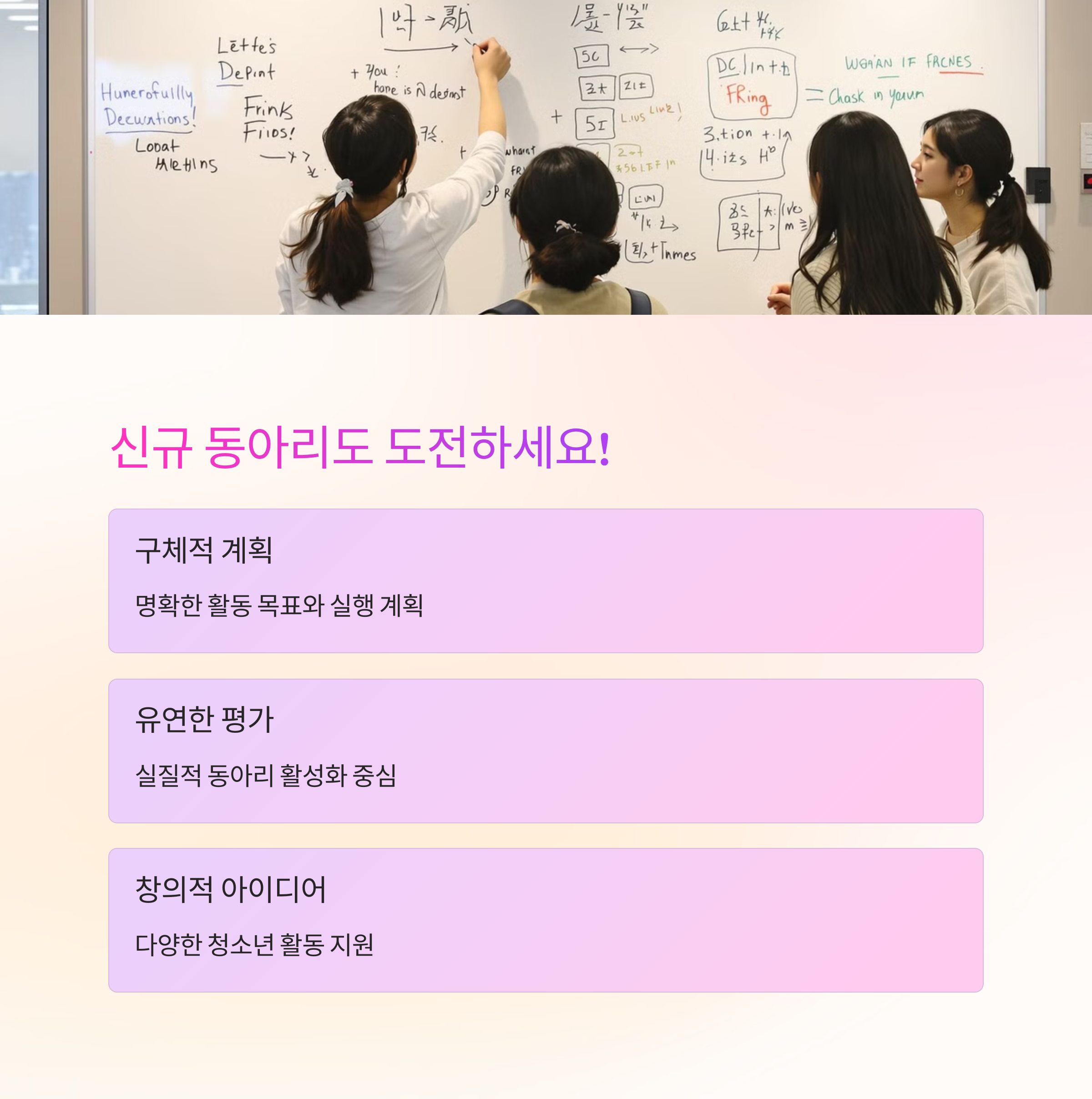 | 청소년 자기계발 기회 제공 | 신규 동아리도 신청 가능 | 방문 또는 우편 신청, 홈페이지 공고 확인 |