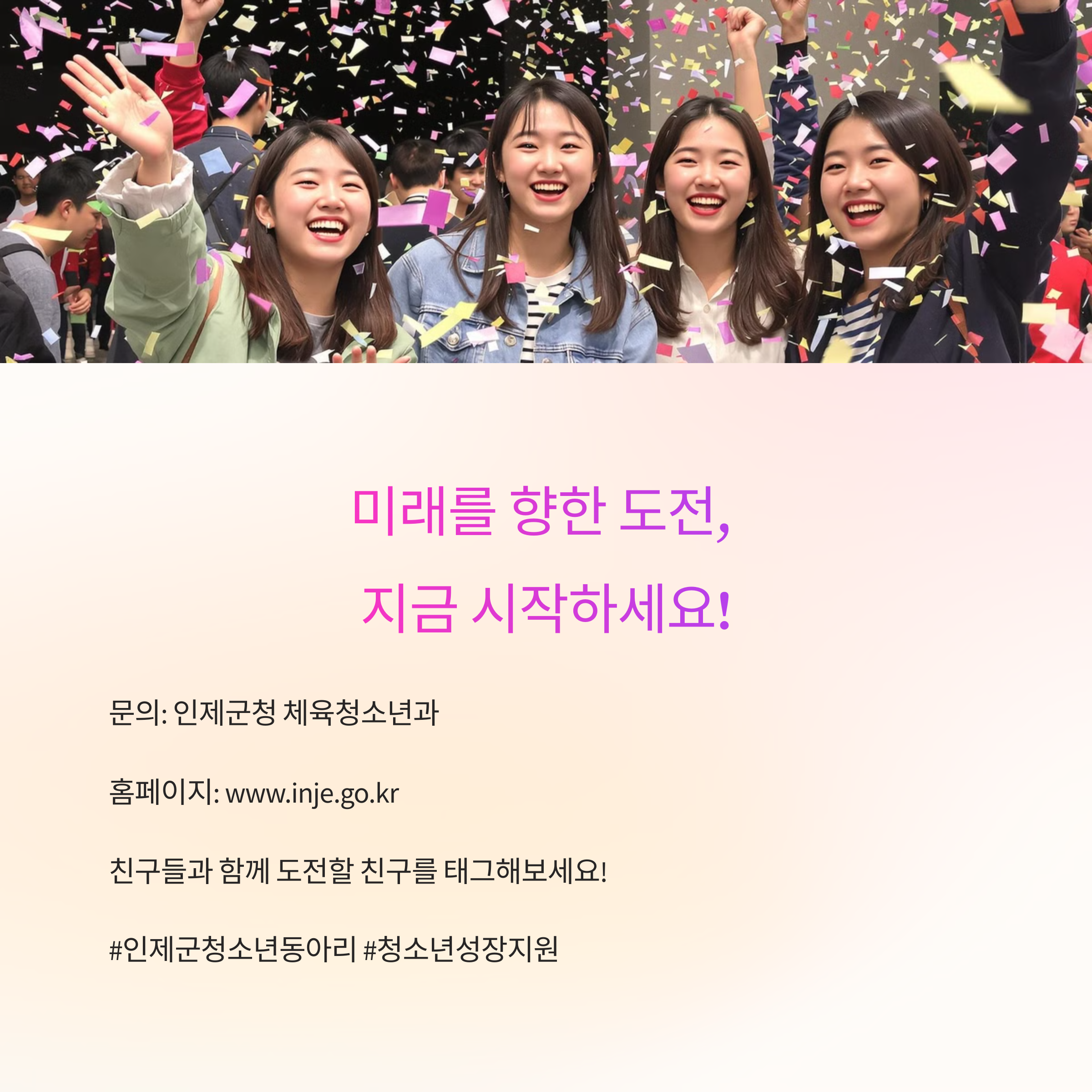 청소년의 자기계발은 미래 사회를 위한 중요한 투자입니다. 인제군의 청소년 동아리 활동 지원사업은 단순한 재정 지원을 넘어 청소년이 자신의 가능성을 발견하고, 사회 속에서 건강하게 성장할 수 있도록 돕는 실질적인 프로그램입니다. 지금 이 기회를 통해 동아리를 더욱 활성화시키고, 지역 청소년들의 꿈과 열정을 현실로 이끌어 보세요.