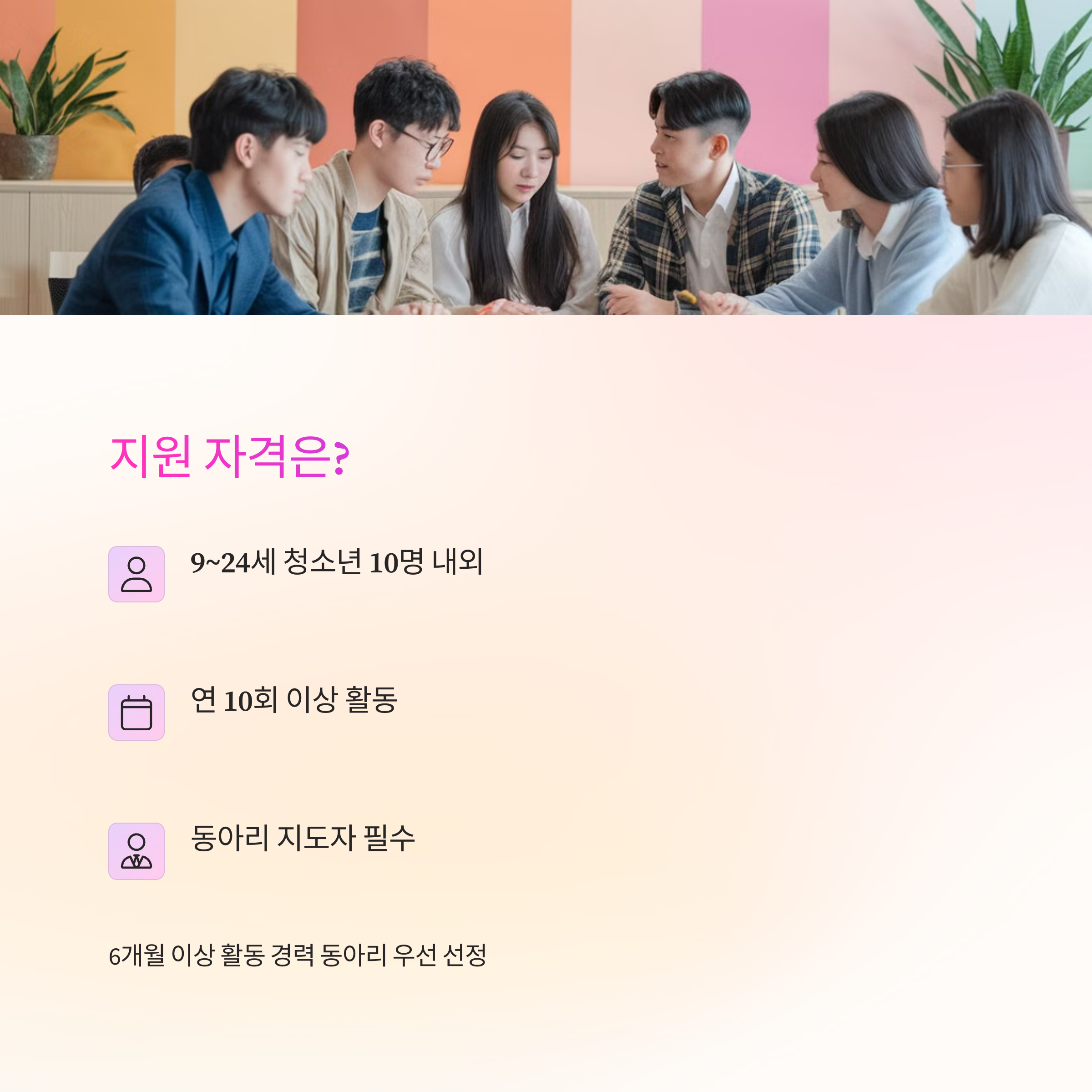 지원 조건은 청소년(9~24세) 10명 내외 구성, 연중 10회 이상 활동, 지도자 배치 등으로 구성되어 있으며, 특히 6개월 이상 활동 경력이 있는 동아리는 우선 선정 대상이 됩니다. 다만, 신규 동아리라도 활동 계획이 구체적이고 활성화 가능성이 높은 경우 위원회 심의를 통해 선정될 수 있어 누구나 도전해볼 수 있는 기회입니다. 청소년 참여 확대를 위한 유연한 운영 기준이 돋보입니다.