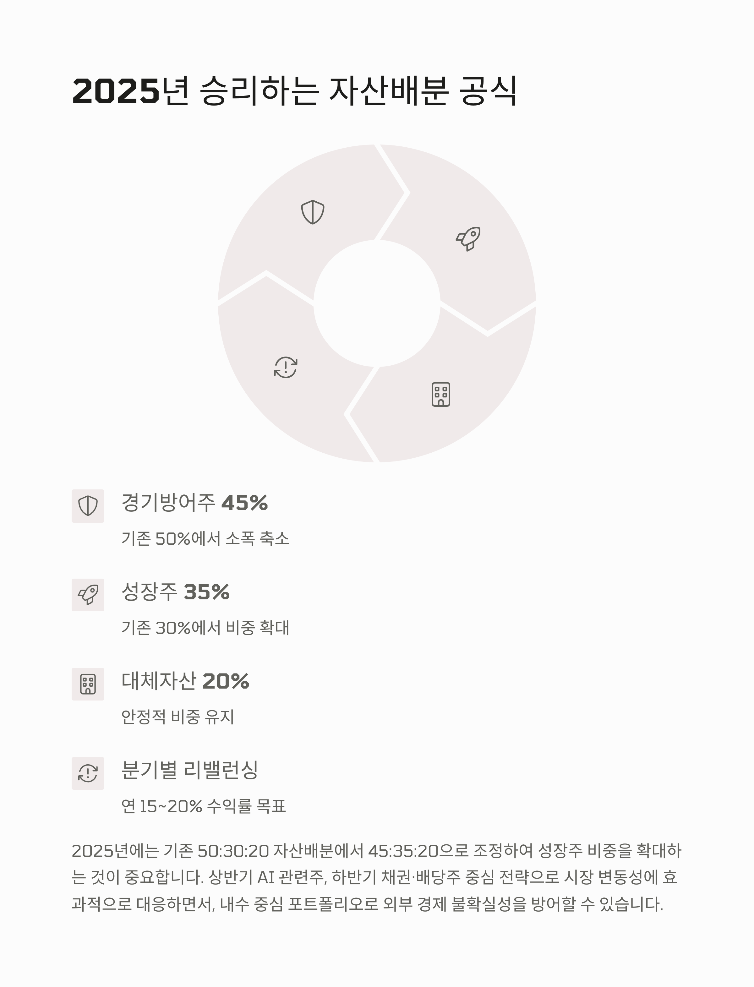 2025년은 AI 기술의 급속한 확산과 글로벌 경제의 불확실성이 동시에 존재하는 복합적인 해입니다. 많은 투자자들이 어떤 전략으로 자산을 배분해야 할지 고민하는 상황에서, 보다 정확한 데이터와 예측 가능한 수익을 중심으로 한 전략 수립이 무엇보다 중요해졌습니다. 최근 AI 주식의 급등락, 미국채 ETF의 월배당 확대, 대체 데이터 기반 투자기법의 부상 등은 우리가 놓치지 말아야 할 흐름입니다. 이 글에서는 2025년을 맞아 안정성과 성장성을 함께 고려한 투자전략을 소개드리며, 각 분기별 투자 포인트까지 상세히 안내드릴 예정입니다. 현시점에서 무엇을 선택하고, 어떤 자산을 줄이거나 늘려야 할지 선명한 그림을 그릴 수 있도록 도와드리겠습니다.