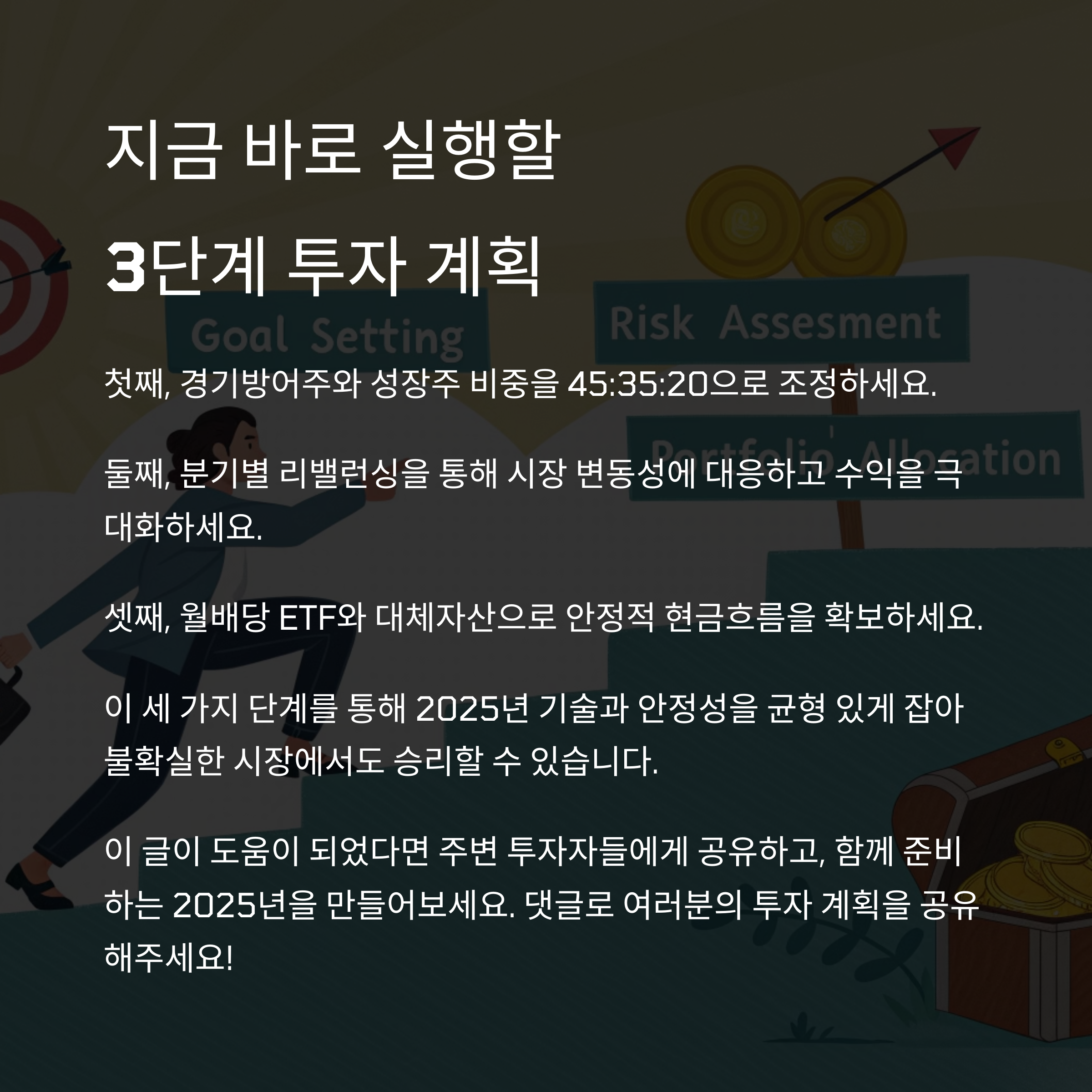 여러분은 2025년 어떤 투자 전략을 계획하고 계신가요? 댓글로 의견을 나눠주시고, 궁금한 점도 자유롭게 남겨주세요. 함께 성장하는 투자 커뮤니티를 만들어가요!