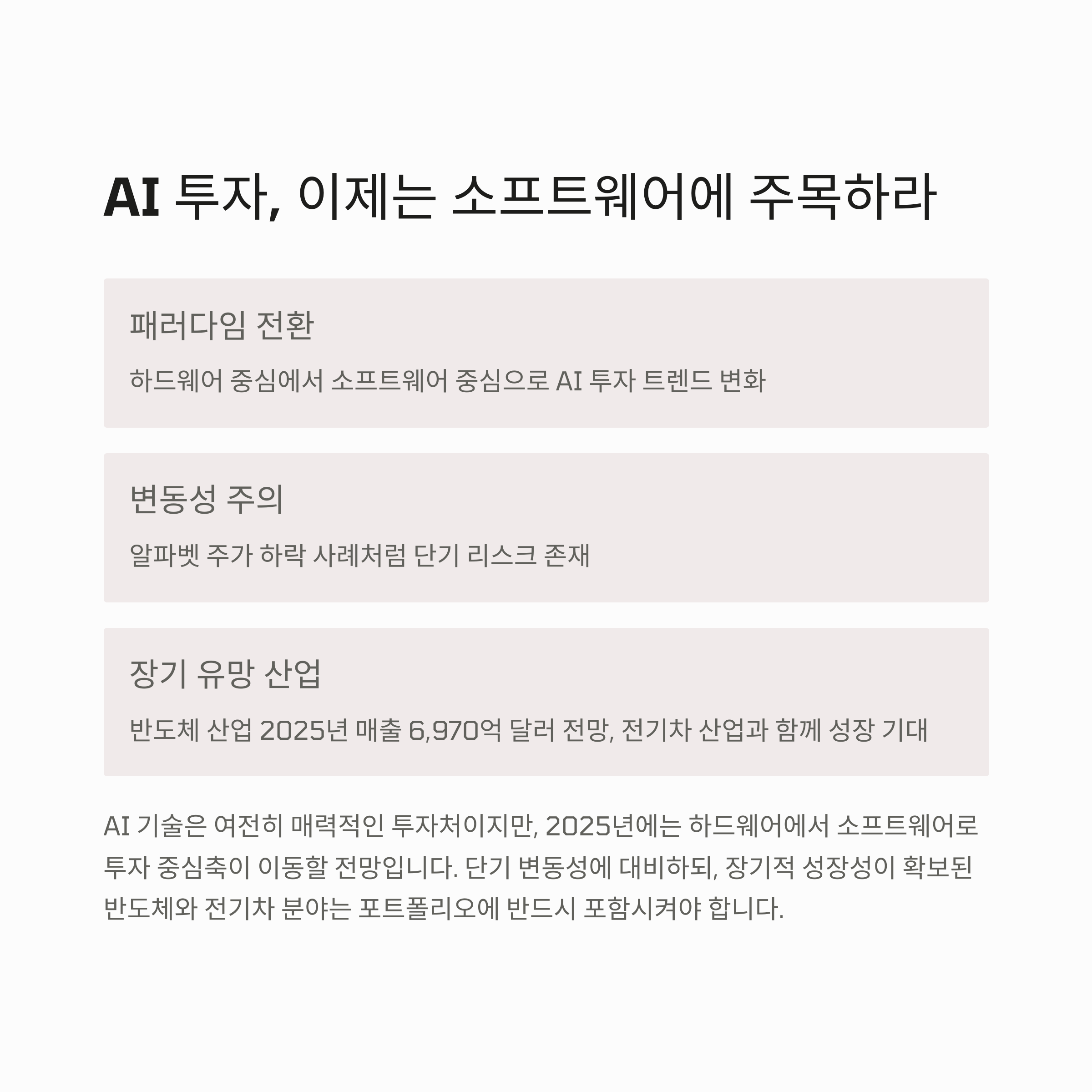 | AI 투자 | 하드웨어에서 소프트웨어로 무게 중심 이동 |